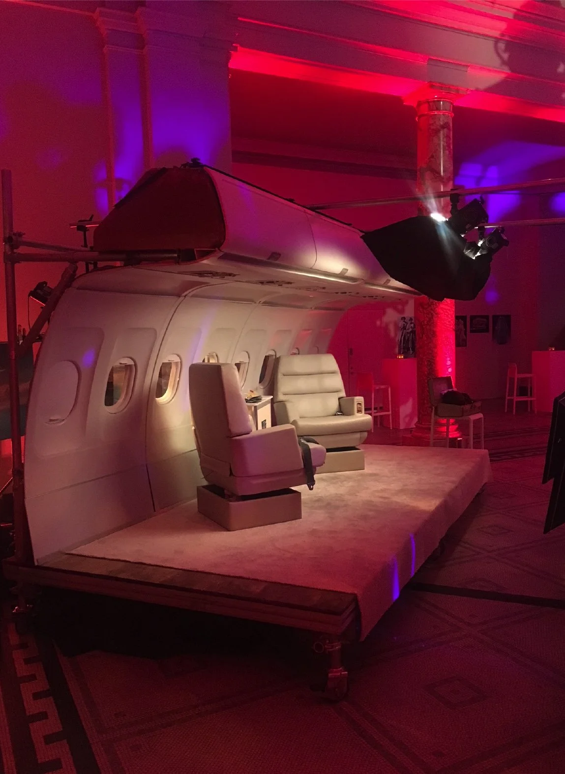 Getting an aircraft interior through the front doors of the V&A was no small challenge but was well worth it. We dressed the plane with cream carpet and a specially designed drinks trolly.